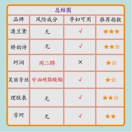 如果你是孕妇或者敏感肌肤,建议选‘澳兰黛’家。没有添加什么刺激成分,几乎无气味,不用担心诱发孕吐,我产后也一直在用~ 油性肌肤或者痘痘肌肤可以试试‘理肤泉’,清爽度个人还是觉得很不错哒。 这两款我个人还是比较喜爱的~