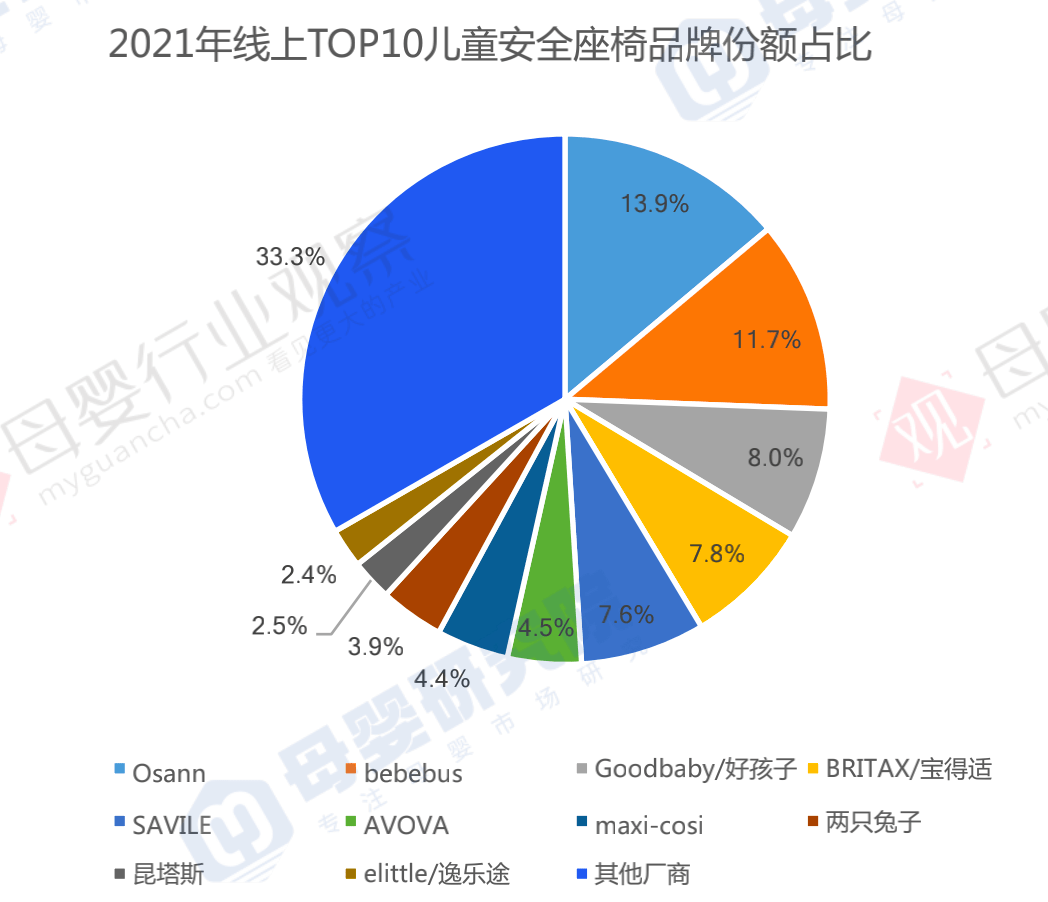 2021年线上TOP10儿童安全座椅品牌份额占比如下: