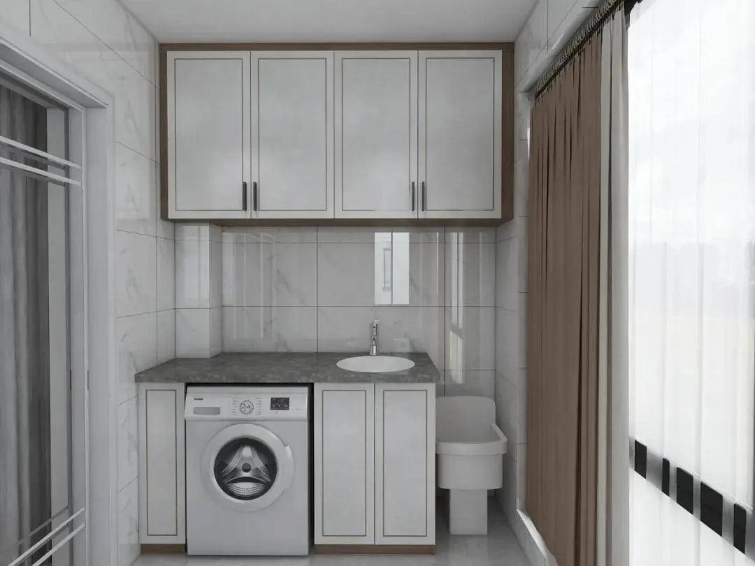 阳台也可以打造一个阳台柜,安装吊柜、储物柜、洗手台,还能容纳下大尺寸洗衣机,整洁实用。