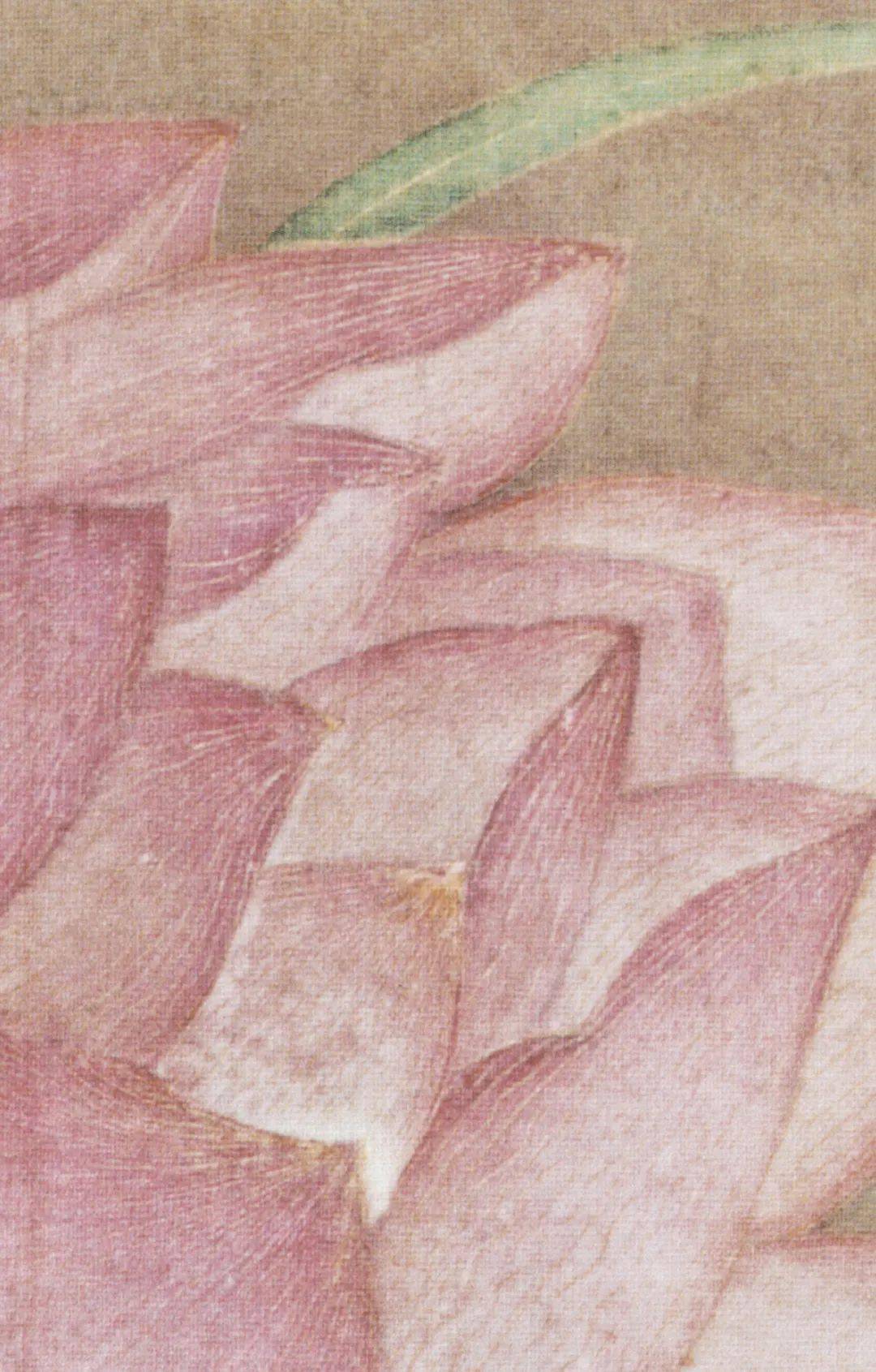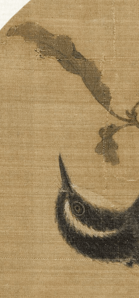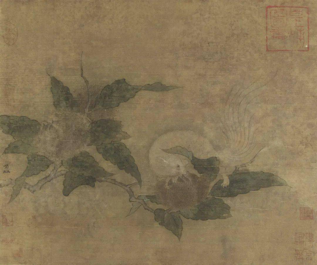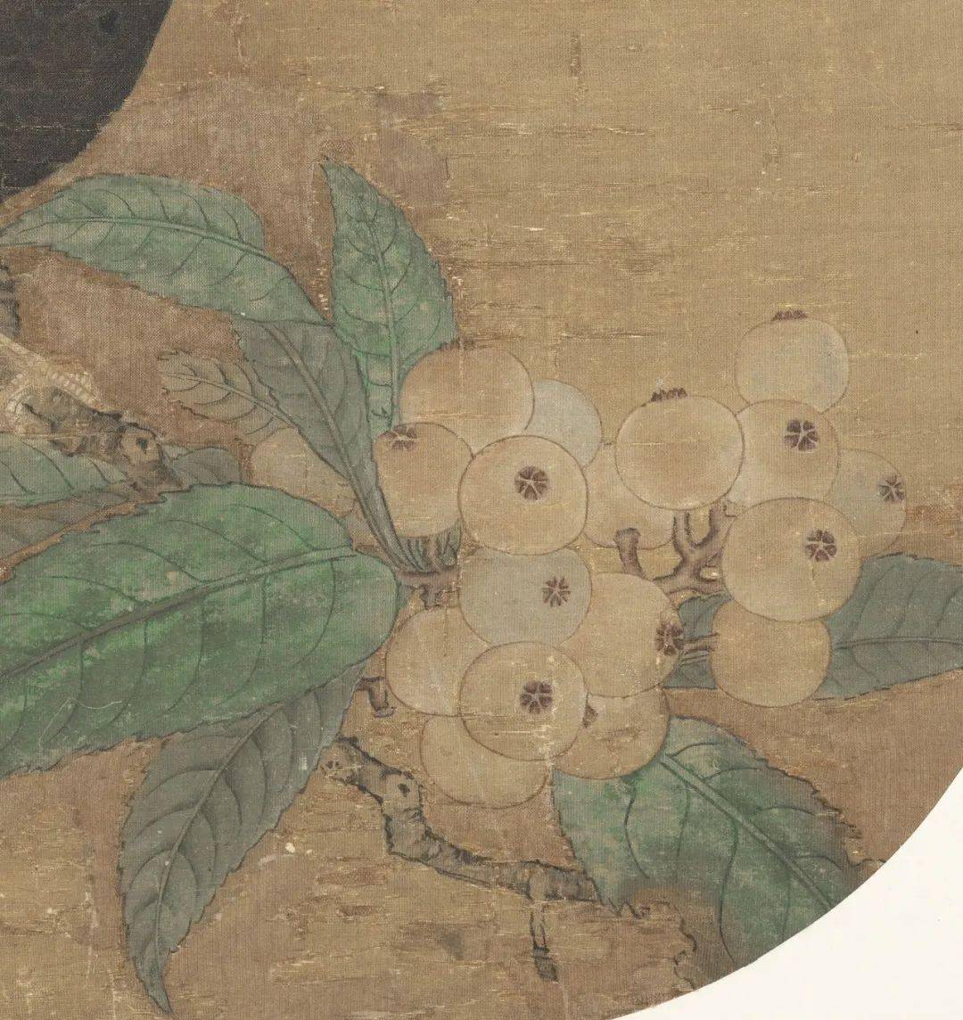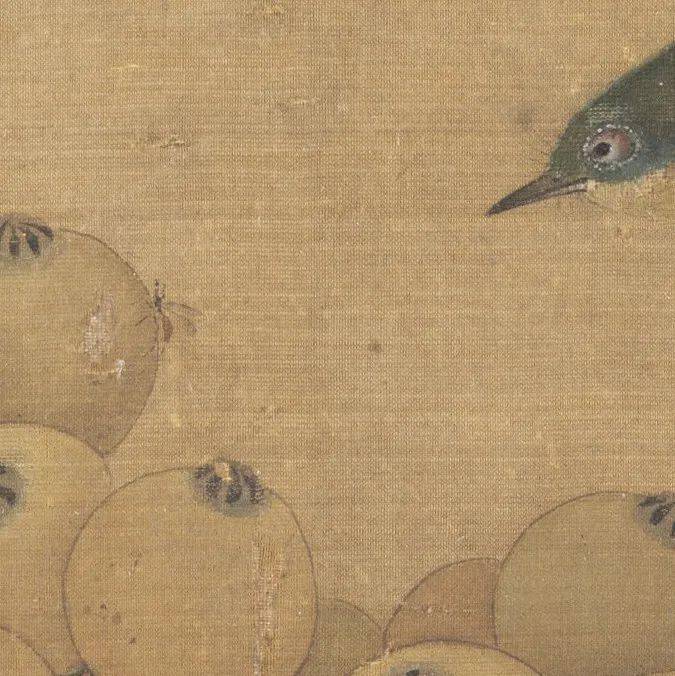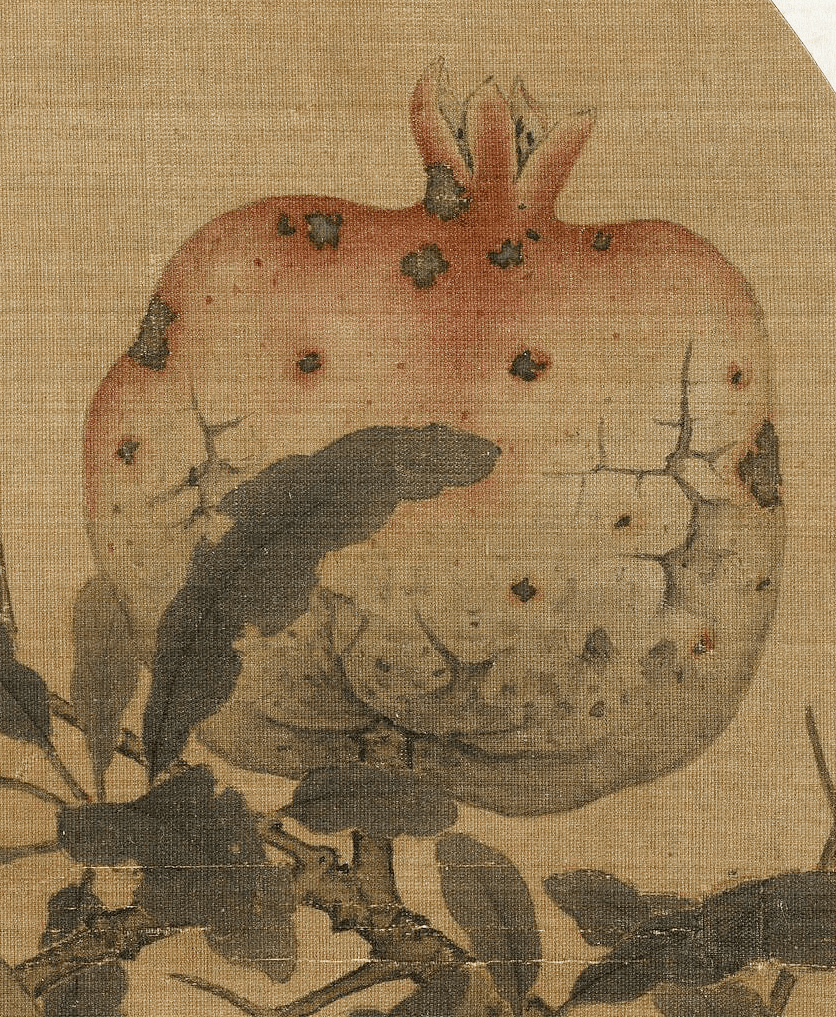 在这幅林椿的 《榴开见子图》中,石榴因熟透而果皮迸裂,斑驳枯烂,叶子卷黄,一只柳莺在榴枝寻见一只飞虫,正欲琢食。石榴桃红的外皮饱满圆润,里头紫红色的子鲜嫩欲滴、粒粒分明,用以象征多子多孙之意。