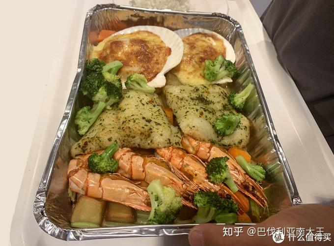 最近刚出的新品,价格相对略贵,但都是真材实料,楼主第一时间买来尝了鲜。鱼肉很鲜嫩,旁边的两个芝士奶油扇贝最好吃,然后是四只黑虎虾,这个虾就是前面介绍过被刨了肚子的芝士奶油焗大虾本人,特别鲜美,搭配了一些新鲜时蔬,吃完美滋滋的那种。