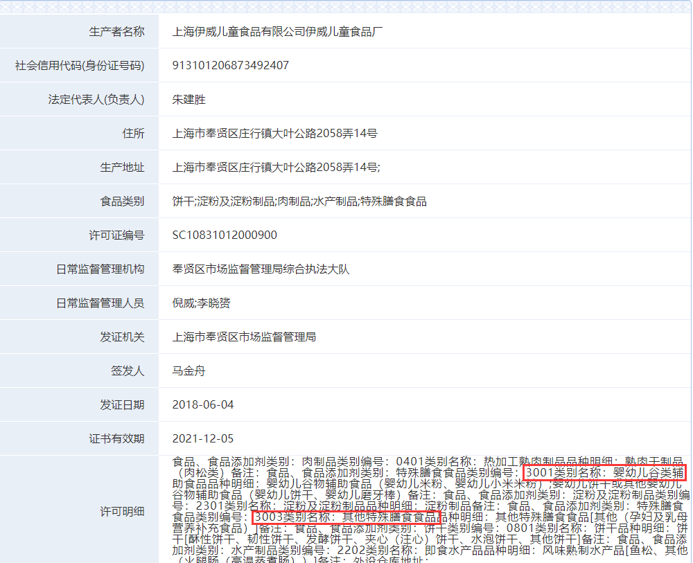 笨爸爸查询这些企业的生产许可证编号,发现只有伊威的生产商,以及秋田满满婴幼儿猪肝粉、井伊的生产商,这三家获得了婴幼儿辅助食品的生产许可。