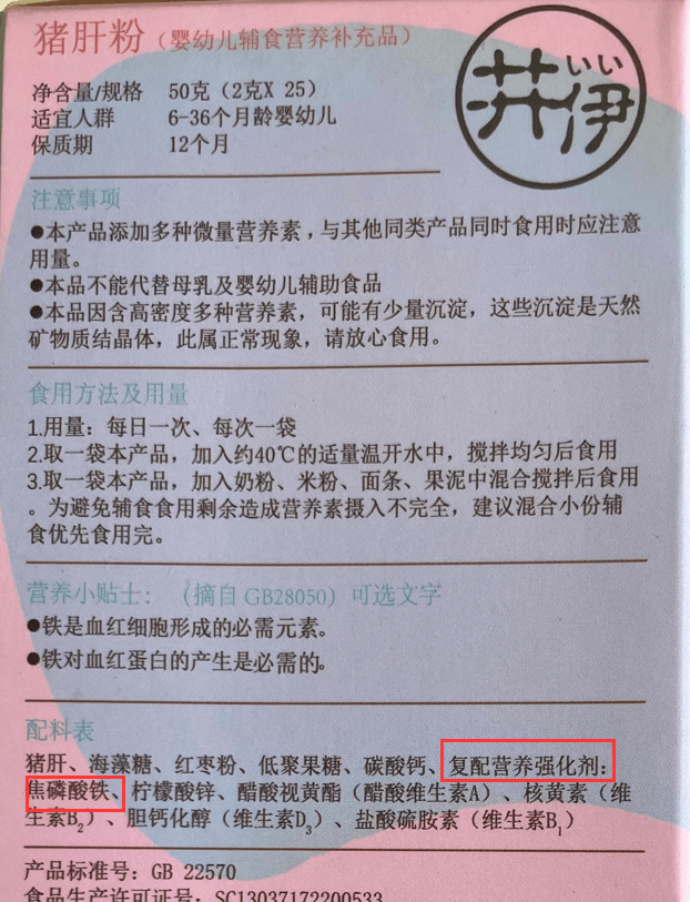 细节隐藏在配料表中,铁含量最高的“井伊婴标猪肝粉“,标注铁含量是325mg/100g,但它的配料表中,同时添加了“复合营养强化剂(铁、锌、维A、维B2、维D3、维B1)“,也就是说,这款猪肝粉中的铁,并不仅仅是猪肝本身的铁含量,而是很大部分来自于额外添加的铁剂,也就是三价铁,非血红素铁。