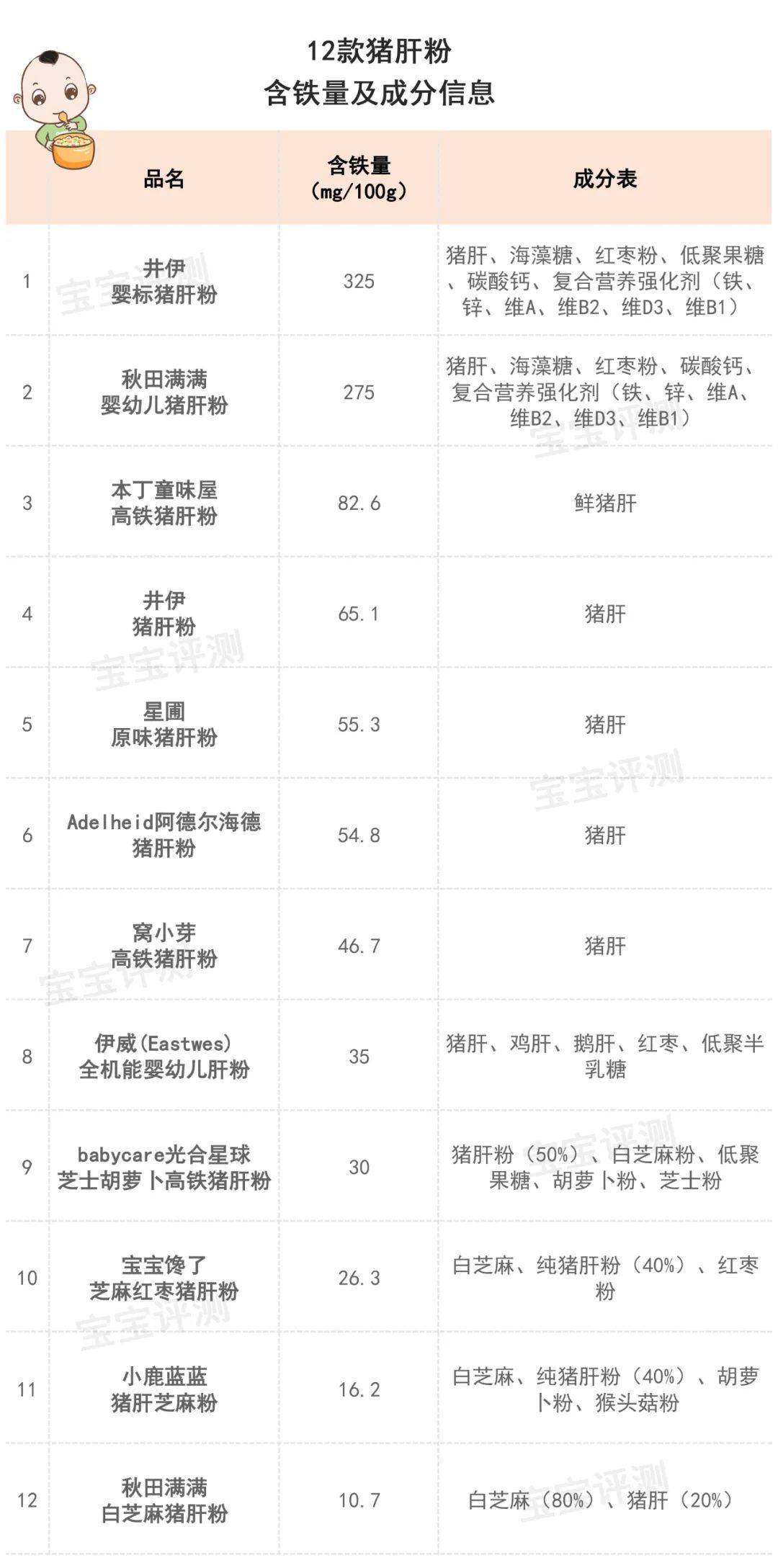宝宝馋了、小鹿蓝蓝、秋田满满白芝麻猪肝粉,主料是芝麻,猪肝只是辅料,所以铁含量低,只接近甚至低于鲜猪肝的铁含量。像秋田满满白芝麻猪肝粉,白芝麻占了80%,猪肝才占20%。