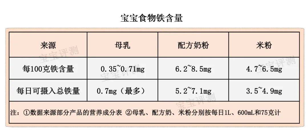 笨爸爸之前做过米粉的评测和对比,通过上表,也能看出,市场上国内版的含铁米粉,铁含量普通在4.7~6.5mg/100g之间;海外版的米粉,铁含量会更高一些,可以达到20~35mg/100g。