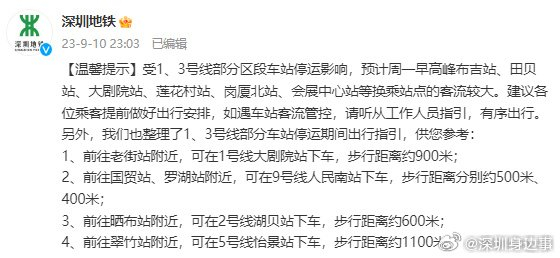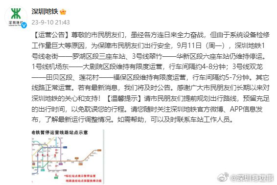 【周知!#深圳地铁1号和3号线个别区段仍停运# 】虽经各方连日来全力奋战,但由于系统设备检修工作量巨大等原因,为保障市民朋友们出行安全,9月11日(周一),深圳地铁仍有部分区段尚未能恢复正常运营。