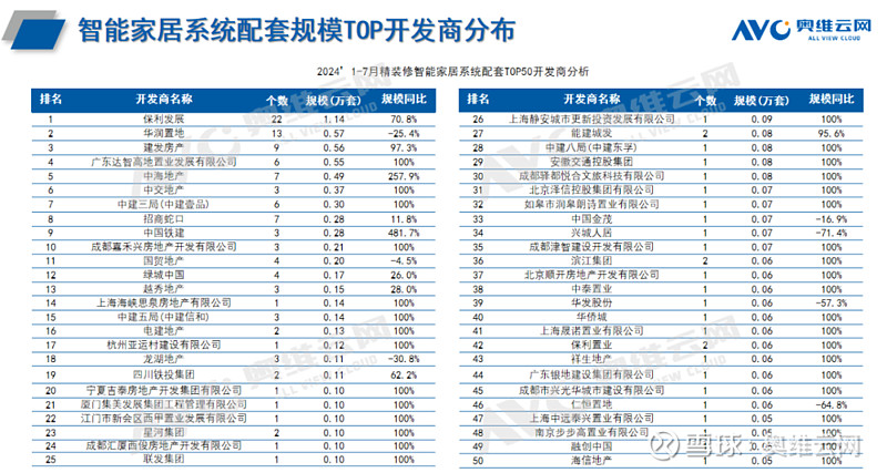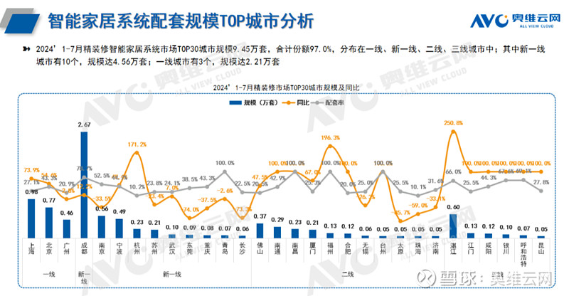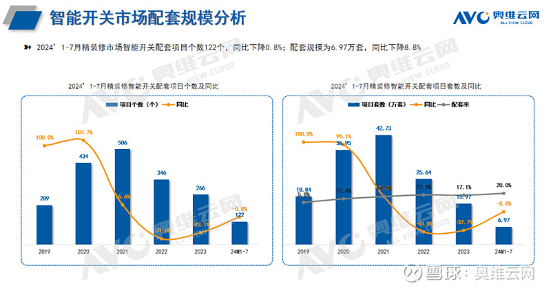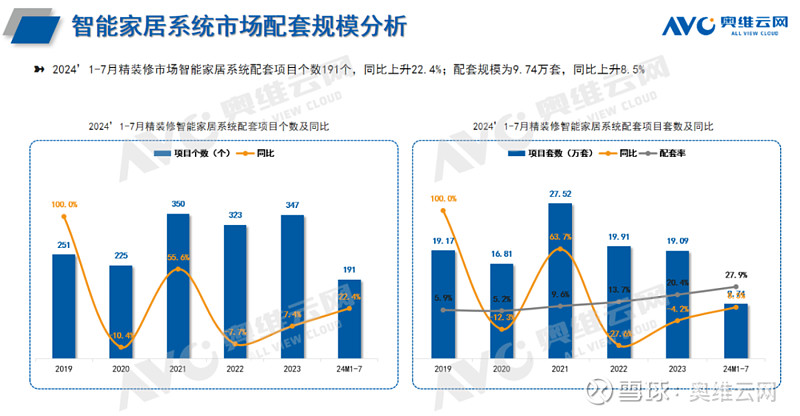 规模分析:智能部品配置率均增长,智能家居系统规模同比增长近10%奥维云网(C)监测数据显示,2024年1-7月精装修市场智能部品(智能门锁、智能开关、智能家居系统)项目精装修市场项目527个,同比-15.4%;规模46.2万套,同比-13.7%。与去年同期相比,智能家居部品降幅收窄20.9个百分比。