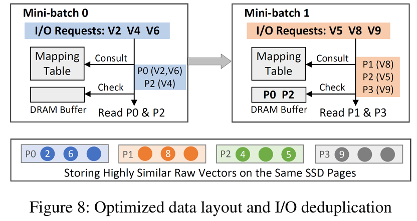基于该优化的数据布局,FusionANNS在执行每个重排序批次时,首先通过映射表确定每个向量所在的页面,合并页面相同的查询。同时在内存中缓存每个批次查询得到的页面,后续批次若所需页面已在缓存中就直接读取,其过程和例子如上图所示。