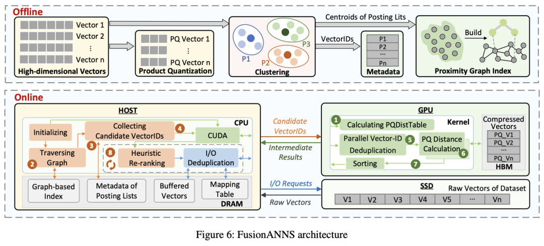 FusionANNS的系统架构如上图所示,分别包含离线的索引处理和在线的协同搜索。