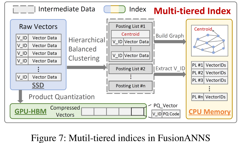 离线部分:FusionANNS先把原始数据进行PQ压缩,并用原始数据进行聚类分成若干个posting lists,然后用每个posting list的聚类中心生成图索引结构,并将每个聚类中的向量ID储存为元数据。最终将图索引和元数据存储在内存中,PQ压缩后的向量存储在GPU的HBM中,原始数据存储在SSD中。