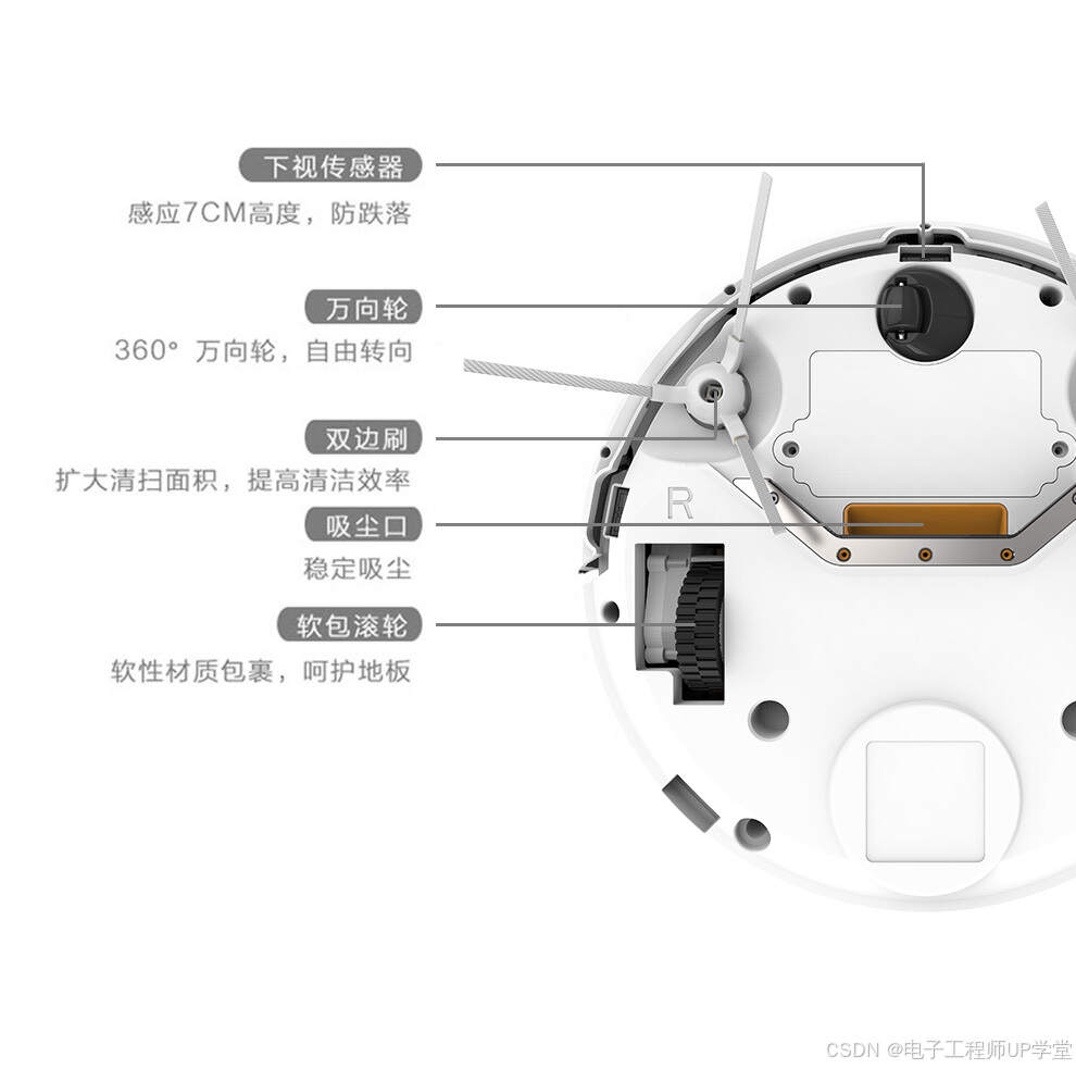 - 安装在机身两侧,将边角的灰尘扫向主刷。