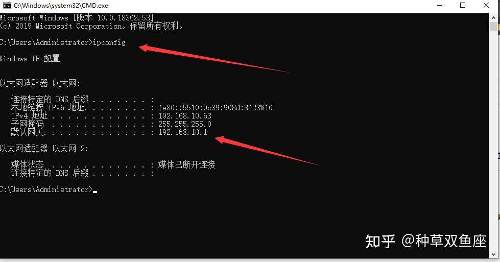 打开CMD窗口后,输入命令 ipconfig 后回车,其中默认网关就是我们的以及路由的IP地址,也就是下图的192.168.10.1