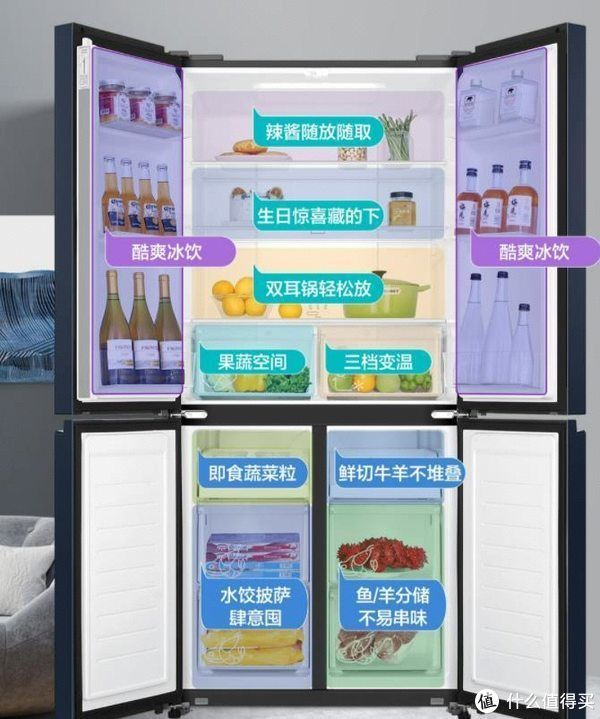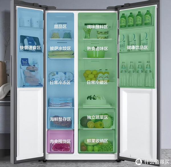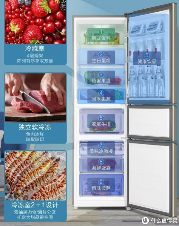 通过加深抽屉和窄缝设计,同容量下利用率更高,满足大家庭的日常囤货保鲜需求。另外干湿分储功能也很实用,性价比很高。