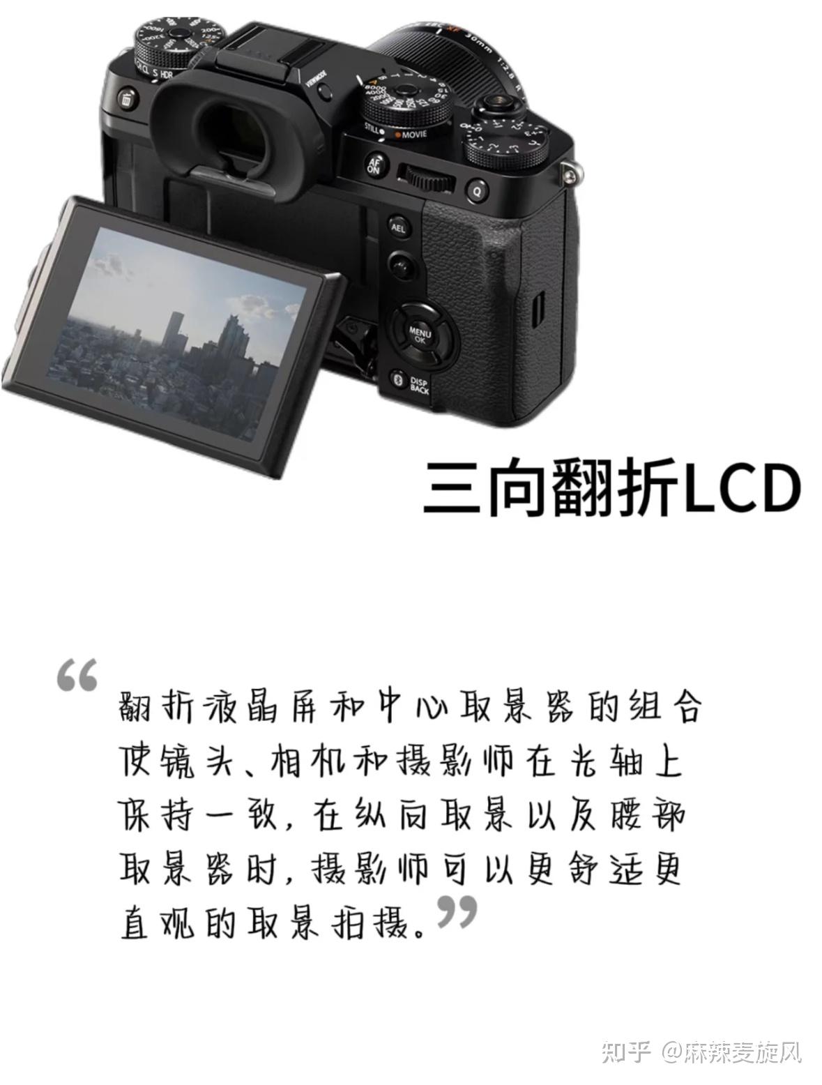 外观上,机身明显比XT5更大,少了两个机械拨盘,取而代之的是一块电子显示屏(肩屏),手柄握持感好,整体设计偏时尚简约,无银色版,只有黑色版本。