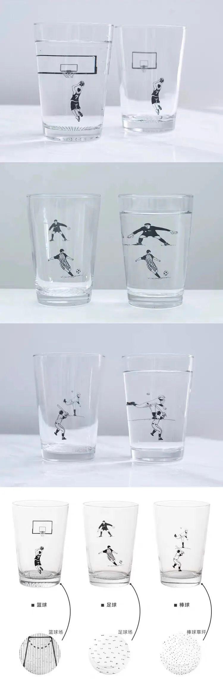 最特别的是篮球棒球和足球主题的这三款,用面对面的插图表现竞争对手之间激烈的竞争。倒水以后水位的高地会决定运动员是否进球。将水倒在球的平行线上,顺着光看上去,就好像球进了一样。