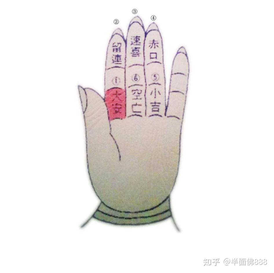小六壬掌诀共有六个,它们是:大安、留连、速喜、赤口、小吉、空亡。称为六种格局,这六种格局在手掌上的位置是固定的,如手掌图所示。