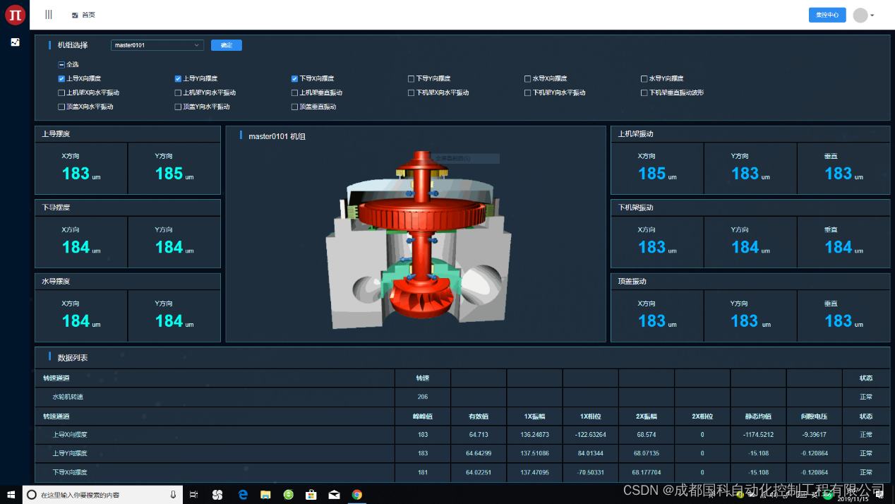 实时监测与趋势分析;机组振动、摆度报警与保护;机组气隙、局放、磁通量监测;机组的稳定性评估及运行优化分析;机组综合信号故障诊断分析;指导机组的维护检修并对检修情况进行评价和分析;以机组振动、摆度及工况量的在线监测为基础故障分析及诊断;完成机组常规实验,并可出具集数据、图标、曲线为一体的完整的实验报告; 五、系统的技术优势 Linux系统架构,更加安全可靠全面的分析手段和完善的诊断知识开放型、智能型探索分析工具硬件高智能化、功耗低、运行高可靠采用高性能实时数据库,适合连续海量数据存储全新的应用展示技术,支持多种类型客户端访问全面数据开发共享接口,与其他系统集成更加简单与智能应用平台相结合,实现多种大数据时代的智能应用GKRS8000水轮发电机组振动摆度在线监测系统的设计思想,是基于水轮发电机组设备的结构特点,结合设备状态监测的需要和常见故障的机理和特征,充分运用现代的信号分析方法、计算机技术、人工智能技术和网络通讯技术等,及时发现设备的异常状态,自动诊断设备存在的问题,并与其它系统实现信息共享,为状态检修提供技术数据。