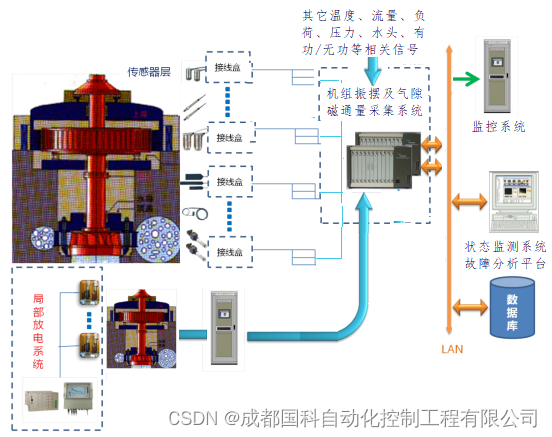 传感器系统:包括摆度、振动、键相、轴位移、气隙(预留接口)、磁通量(预留接口)、局部放电(预留接口)、压力脉动、前置器、线缆及其他辅助设备;现地保护仪表,提供传感器电源、信号处理,报警、跳机值设定,逻辑组态与执行,保护动作输出,数据显示等,包括:机组振摆保护GKRS8000系统及其他附件;状态监测分析诊断系统,主要通过通讯接口将机组状态监测采集系统所采原始数据上传至系统软件中,对各监测机组进行故障的提前预警,及事故的根源查找。