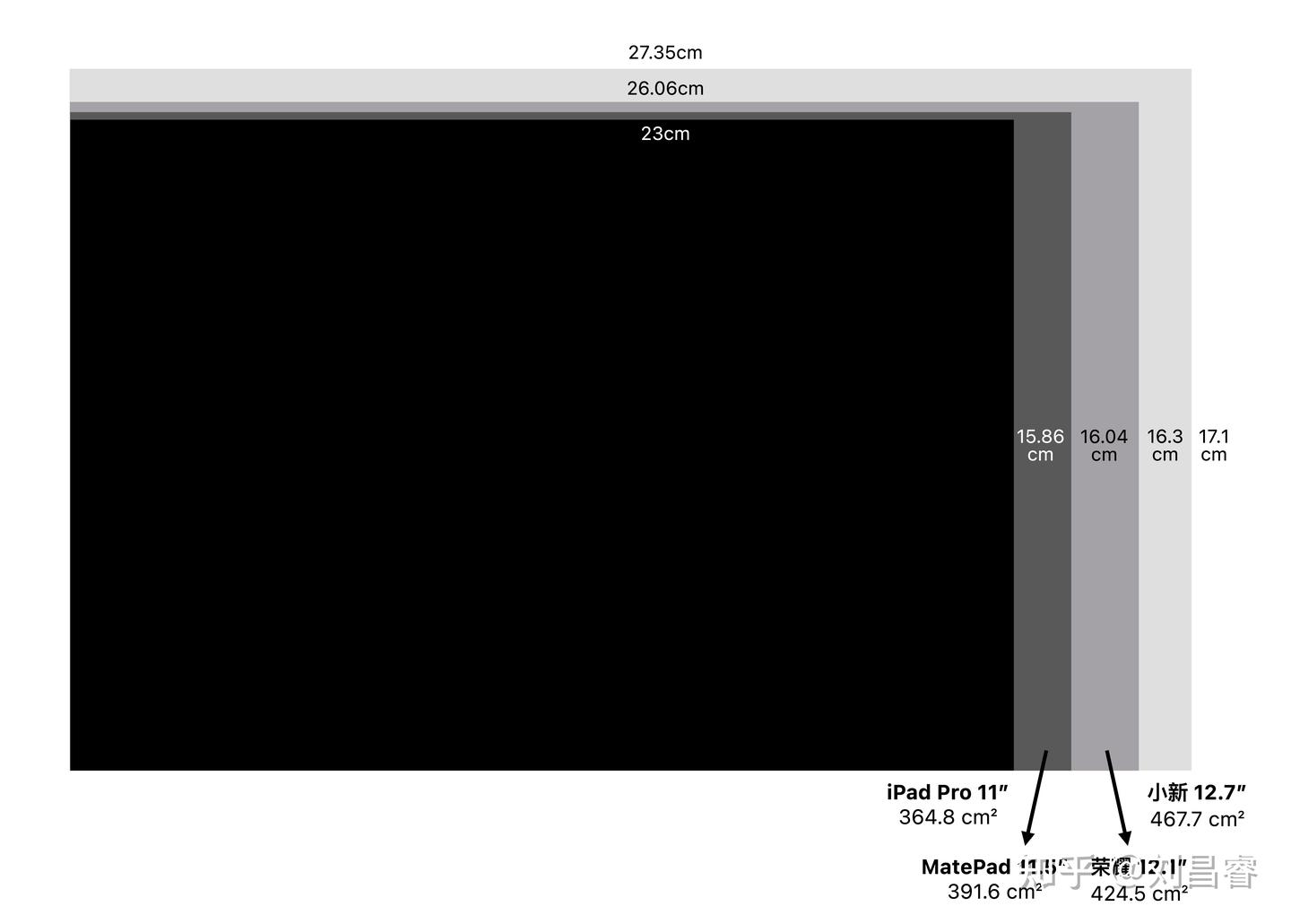 屏幕尺寸首先来讲讲屏幕尺寸,顾名思义,Pad Pro 12.7" 采用 12.7" 16:10 大屏,屏幕面积为 467.7cm²,比更贵的两款柔光屏竞品都大不少,我也做了一张更直观的示意图