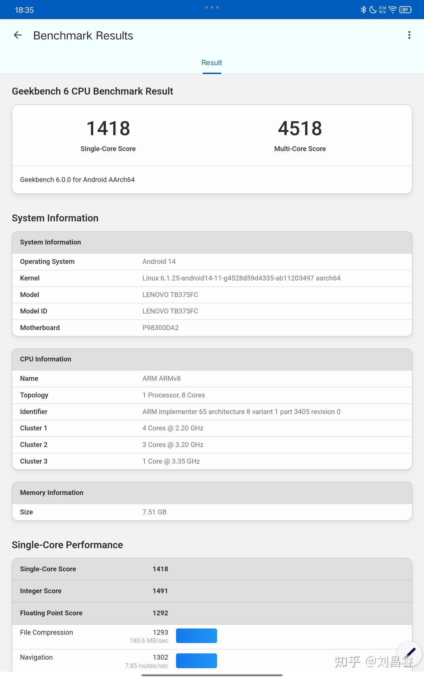 性能跑分安兔兔室温跑分实测 121WGeekBench 6 单核 1418、多核 4518 分