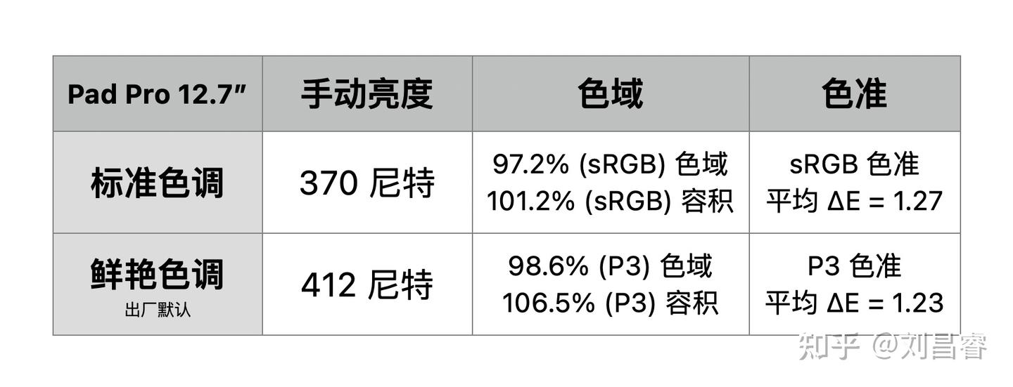 出厂默认的鲜艳色调根据 P3 校准,亮度更高,切换为标准色调则是以 sRGB 校准