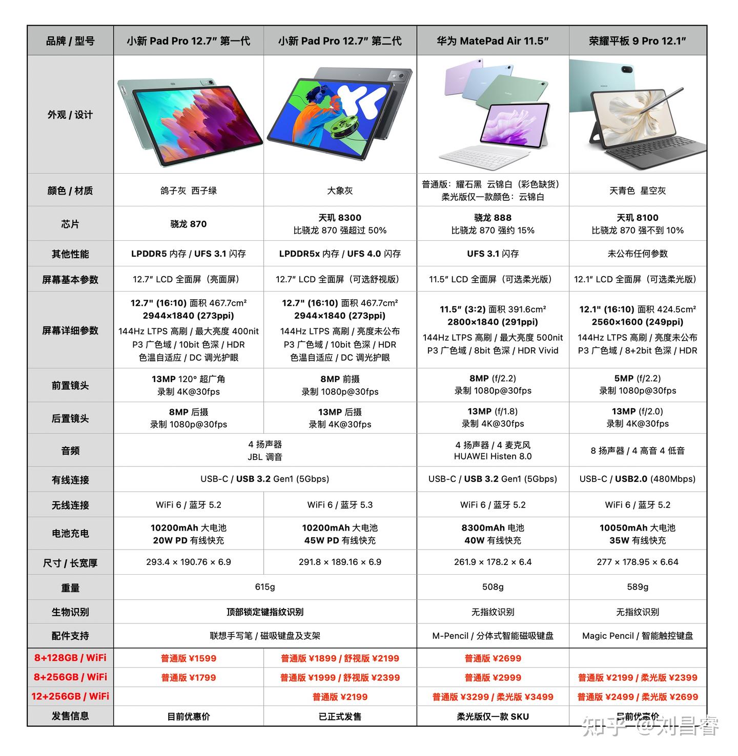 参数对比竞品我选了两款带 AG 屏的友商:MatePad Air 11.5"、荣耀平板 9 Pro