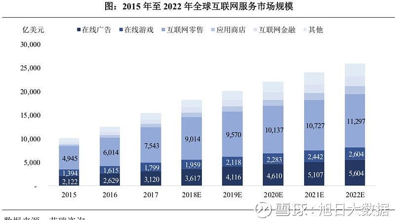 数据显示,2015年-2017年,全球互联网服务市场规模从10106亿美元上涨到15409亿美元,年复合增长率为23.5%,预计到2022年将达到26009亿美元,2017年-2022年均复合增长率为11.0%。
