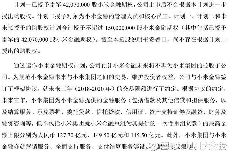 招股书显示,为规范小米金融未来与小米集团之间的交易,维护投资者权益,小米集团与小米金融签订了框架协议,就未来三年(2018-2020年)的交易限额进行了约定。