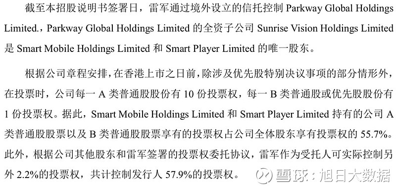 招股书显示,小米执行董事、董事长兼首席执行官雷军通过Smart Mobile Holdings Limited和Smart Player Limited持有的公司A类普通股股票以及B类普通股股票享有的投票权占公司全体股东享有投票权的55.7%。此外,根据公司其他股东和雷军签署的投票权委托协议,雷军作为受托人可实际控制另外2.2%的投票权,共计控制发行人57.9%的投票权。