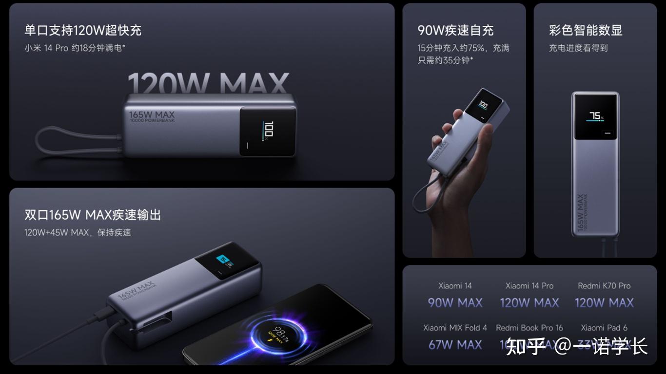 这款也是小米2024年新出的一款柱形设计的充电宝,体积小巧,单手可握,彩色智能数显,内置 10000mAh 电池,总输出功率为 165W。