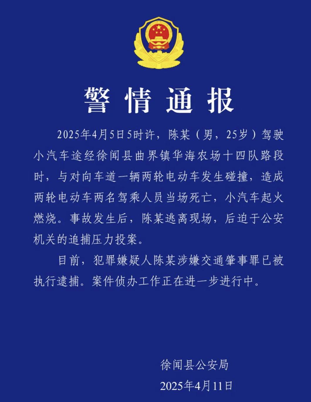 红星资本局4月11日消息,今日,广东徐闻县公安局发布警情通报称,4月5日5时许,25岁的陈某驾驶小汽车途经徐闻县曲界镇华海农场十四队路段时,与对向车道一辆两轮电动车发生碰撞,造成两轮电动车两名驾乘人员当场死亡,小汽车起火燃烧。事故发生后,陈某逃离现场,后迫于公安机关的追捕压力投案。