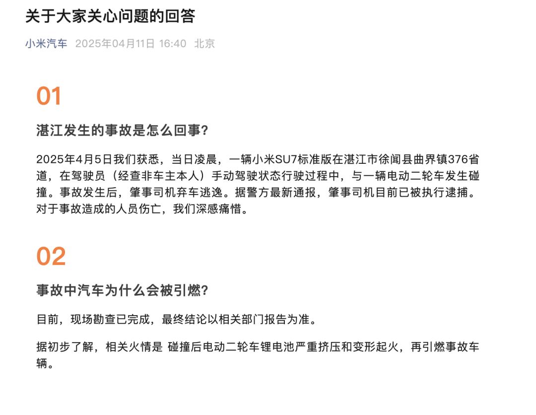 同日,据钱江晚报报道,小米汽车就湛江SU7事故发布情况说明:2025年4月5日获悉,当日凌晨,一辆小米SU7标准版在湛江市徐闻县曲界镇376省道,在驾驶员(经查非车主本人)手动驾驶状态行驶过程中,与一辆电动二轮车发生碰撞。