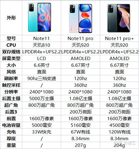 先来看看Note11系列和Note10系列以及Note9系列的配置对比