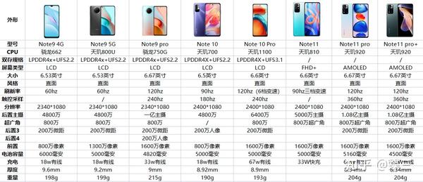 本文中所涵盖的机型较多根据较为分为千元左右:Note9 4G、Note9 5G、Note10、Note11