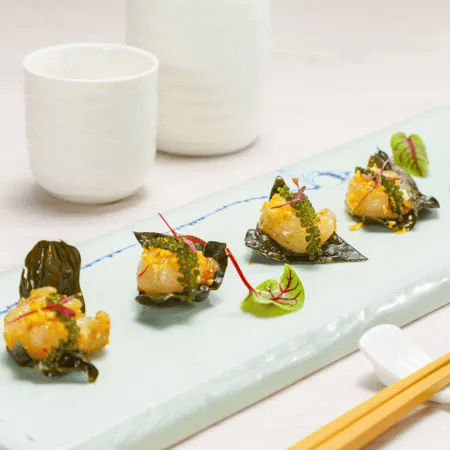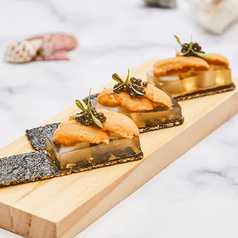 5. 将海鲜冻放在海苔脆皮上,加上海胆和装饰即可。
