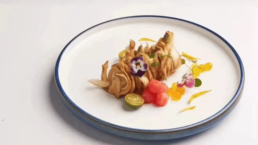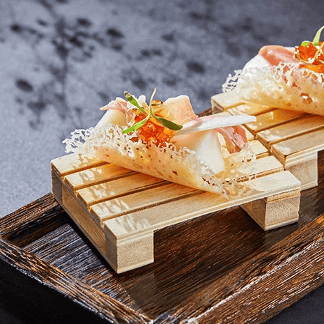 主料 水蜜桃100克 西班牙火腿片2片 辅料 帕马森芝士卷3个 小料 食用花0.5克 调味料 醋汁鱼籽 烹饪步骤
