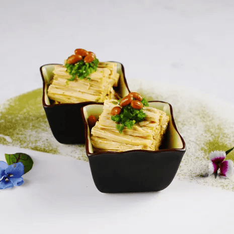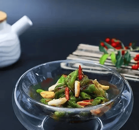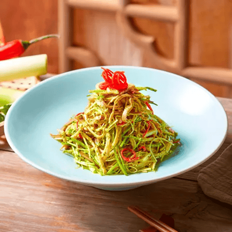 2. 加入薄荷豉鲜汁拌匀装盘,上面加红椒丝装饰即可。