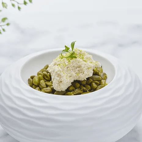 主料 甜豌豆200克 西班牙火腿片2片 辅料 小西米墨鱼汁脆片3片 调味料 鸡粉5克 黑松露酱5克 番茄汁鱼籽 烹饪步骤