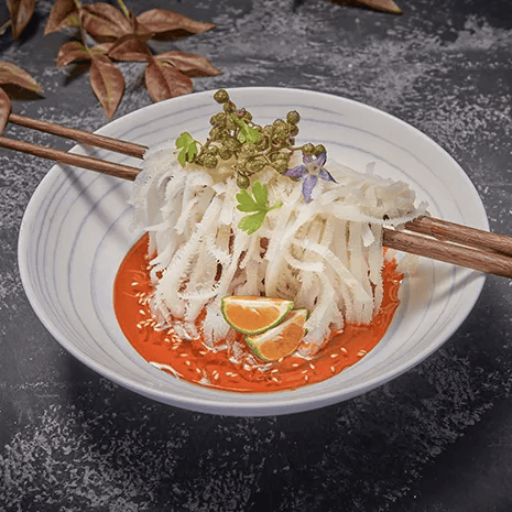 3. 主料用筷子摆放装盘,碗中倒入35克担担汁,放上小料即可。