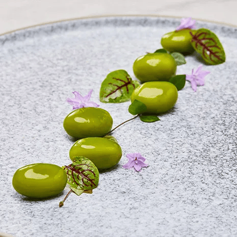 4. 冷冻好的石子用牙签插好裹上青花椒翡翠皮,凝固后装盘即可。