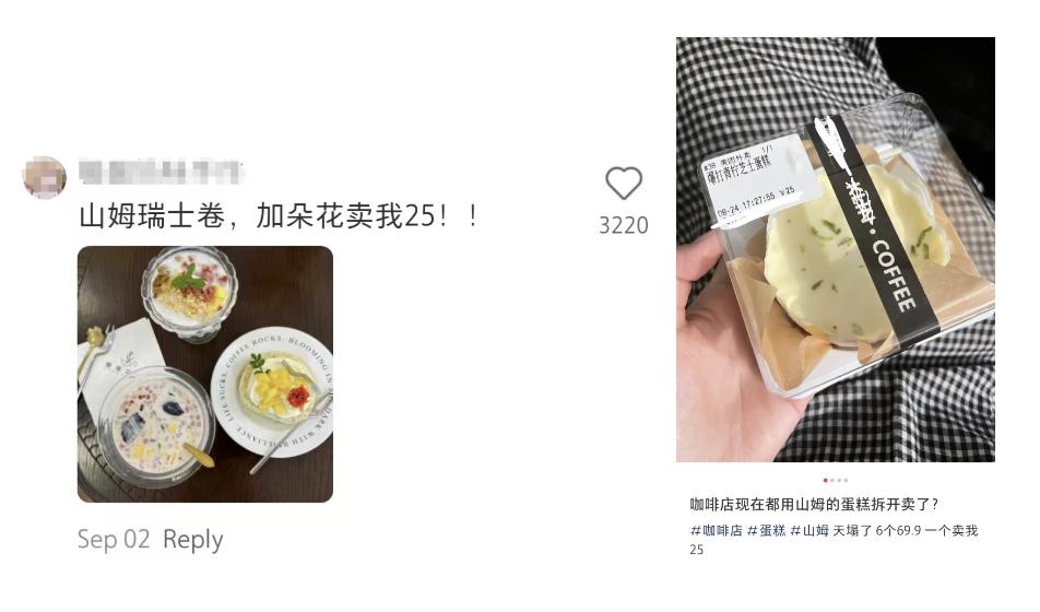 因此,便宜大碗、口感中上、卖相稳定的甜点,比如山姆瑞士卷,就成为了咖啡厅进货的不二选择。