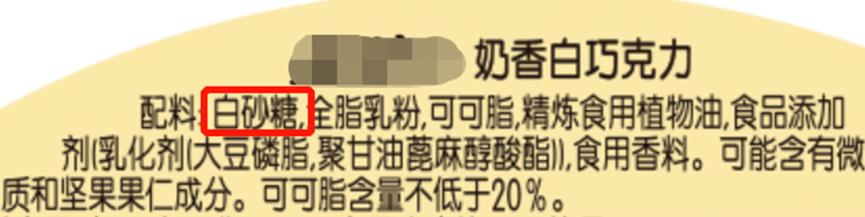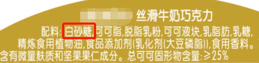 而另外两种巧克力,配料中往往会添加较多的白砂糖,比如下图这两款巧克力,排在配料表第一位的都是白砂糖,根据《预包装食品标签通则》的规定,食品包装配料表需要按照用量由多到少的顺序排列,也就是说:排名越靠前的加得就越多。