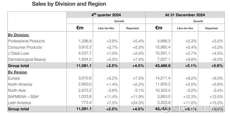 从地区来看,2024年,除北亚市场外,欧莱雅集团在欧洲、北美、拉美以及新兴市场SAPMENA – SSA(南亚太、中东、北非、撒哈拉以南非洲)的销售额均实现了增长。