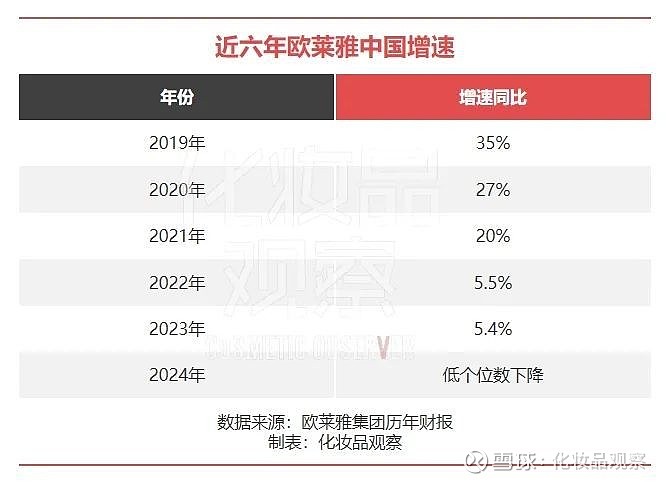 中国作为欧莱雅最具战略意义的市场之一,正在进入明显的增速放缓。到了2024年,欧莱雅在中国的增速已经由正转负。