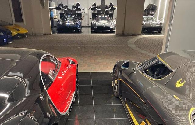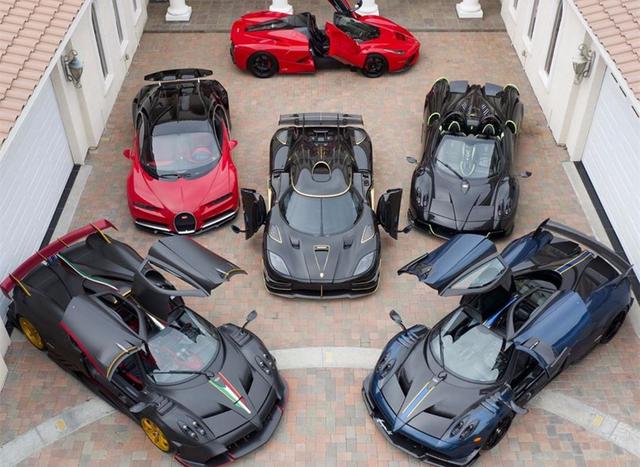 这6台车如果是在国内,那么总价差不多在2亿人民币,这每一台车都是定制版,没有第二台一模一样的。最上面红色的是法拉利拉法敞篷版,全球209台,如今在国内的价格超过4000万人民币。红色布加迪熙龙,基本起步价格就是250万欧元,选配不算,选一个车身颜色就要18万欧元。布加迪旁边的是科尼赛克金凤凰Agera RS,Mike Yin从另一位大佬车主手中购入,入手的价格是410万美金,其余三台则都是帕加尼。