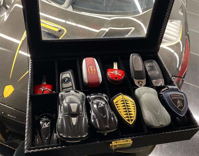 如果说兰博基尼算不上什么超级跑车,那来看看车主其它的一些超跑。法拉利拉法的车钥匙要两把,一把布加迪的钥匙,三把兰博基尼的钥匙,四把帕加尼的钥匙,1把科尼赛克的钥匙,1台宝马的钥匙,当然,这些车都放置在了车主海外的车库中。这位神秘华人Mike Yin的车库一直都是车迷们讨论的焦点,据车主对外展示的图片中可以看到,有3台科尼赛克和3台帕加尼是经常出现的。