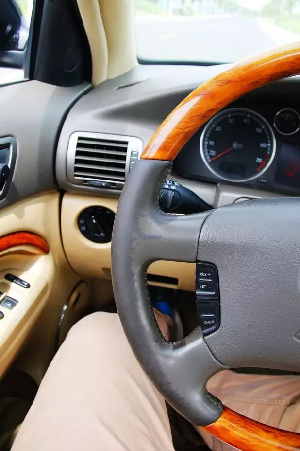 主驾驶的面板,没有采用真皮包裹,而是一块看起来非常廉价的塑料,这个非常容易掉漆,几乎每辆老帕萨特都是这个德行,看着很不爽,不应该啊