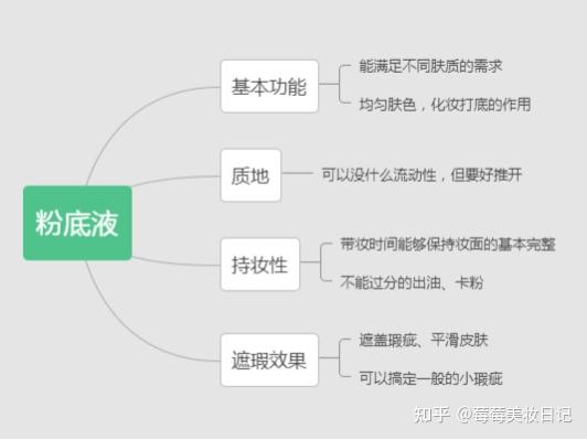 粉底液应具备的条件功能、质地、遮瑕、持妆这几点要做到上述要求。