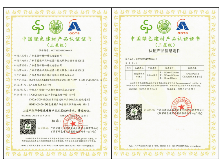 据了解,国家绿色建材标识认证是由国家住建部、工信部联合发起,旨在表彰在绿色低碳、节能减排、生态环保方面取得突出成就的企业的重要举措。“建研晟创”无机人造石系列产品经过了原料供应、制造流程以及运输过程等多项品质指标的严格检验,在性能品质、能耗等方面高度符合绿色发展方向及绿色建材的标准。