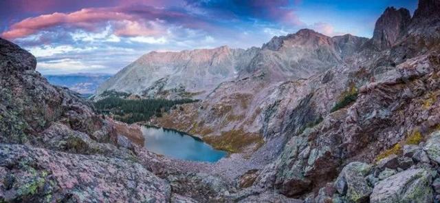 这两张照片拍摄于同一机位,前者用广角拍摄,展示了整个大场景,包括山谷的两侧,前景处的岩石纹理和远处的山峰;而第二张图由长焦拍摄,直接将目光聚焦在远处的山峰上,展示了山峰的形状和其它地形地貌细节。